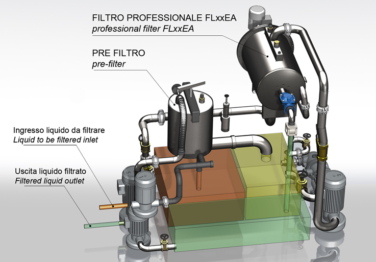 Da una vasca viene prelevato il liquido da filtrare, portato all’interno di un PRE-FILTRO che ha il compito di raccogliere i residui grossolani.